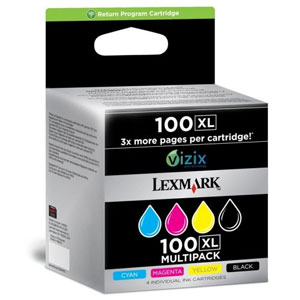 Lexmark 100XL quad pack (14N1921E) return program inks include black, cyan, magenta and yellow cartridges. They deliver 510 pages for black and 600 pages for cyan, magenta and yellow @ 5% average coverage. All cartridges in Lexmark 100XL quad pack use innovative Vizix print system. Lexmark printers using Vizix technology makes it stand out from other competitors. Lexmark Vizix delivers clean, sharp text and photos with consistently bright colours and vivid detail through its innovative printhead technology. Vizix printheads improve the precision of holes through which ink is dispersed on paper. This produces exceptional accuracy in ink dot placement for clearer text and photos. Vizix printheads are larger in size to improve printer speed and more durable ensuring consistent results over lifetime of your printer.